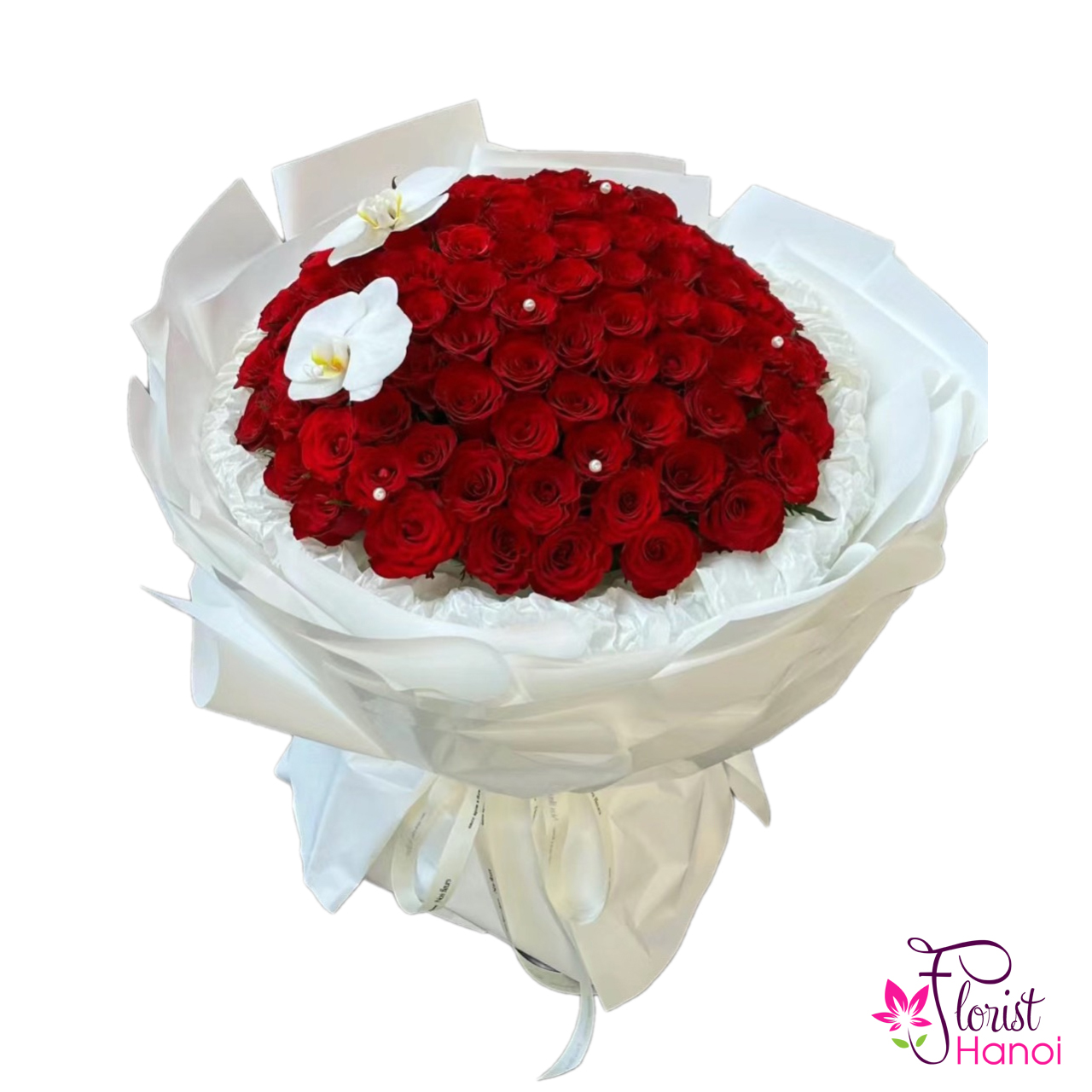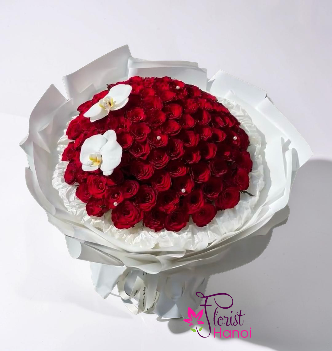 This bouquet consists of 99 fresh rose stalks and phalaenopsis orchids with beautiful wrapping. A bouquet of 99 red roses is a statement whose meaning every woman certainly understands.