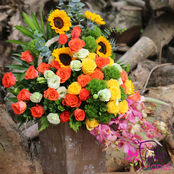 Brighten your loved one’s day with this beautiful floral arrangement fearturing yellow sunflowers, orange roses, green wickey and orchids, which are accented with lush greens. Artfully hand-arranged in wooden basket this flower bouquet is a delightful gift for any occasion. Send an orange rose centerpiece for a dinner or event.