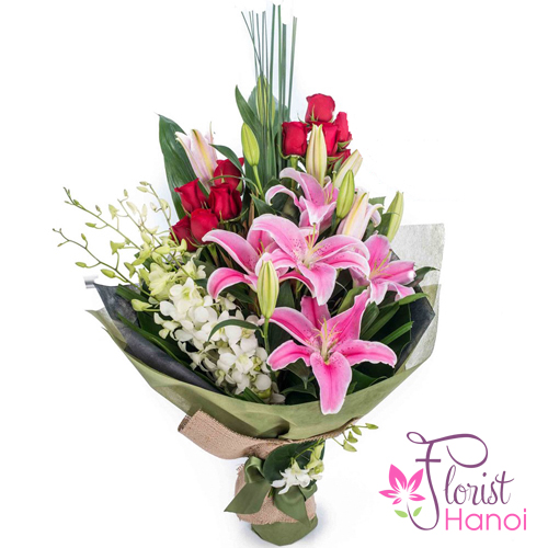 This bouquet speaks of vibrabcy and joy. We guarantee that it is impossible to be said in its presence. Be careful though, it has the power to bring tears of happiness to your loved ones. 3 stargazer lilies with beautiful roses and orchids.