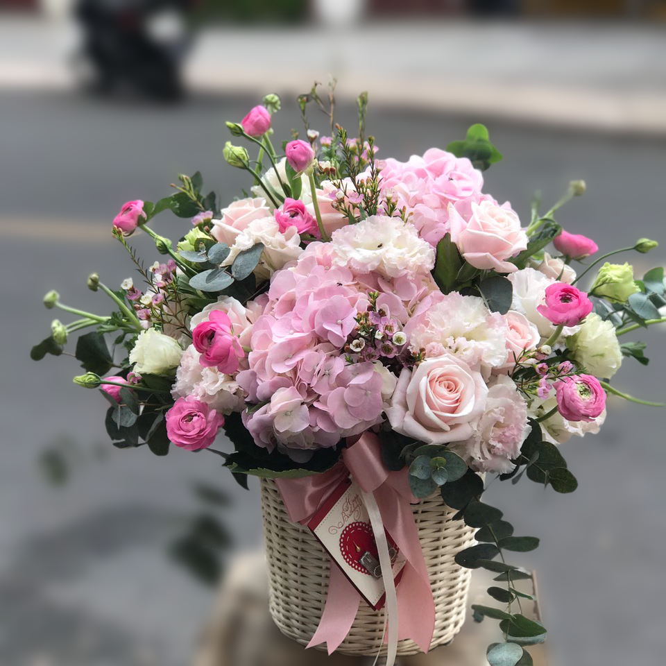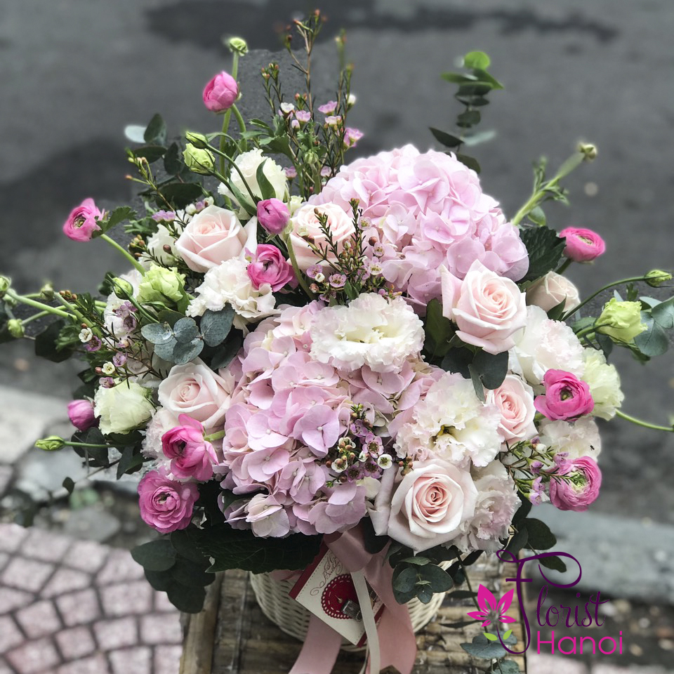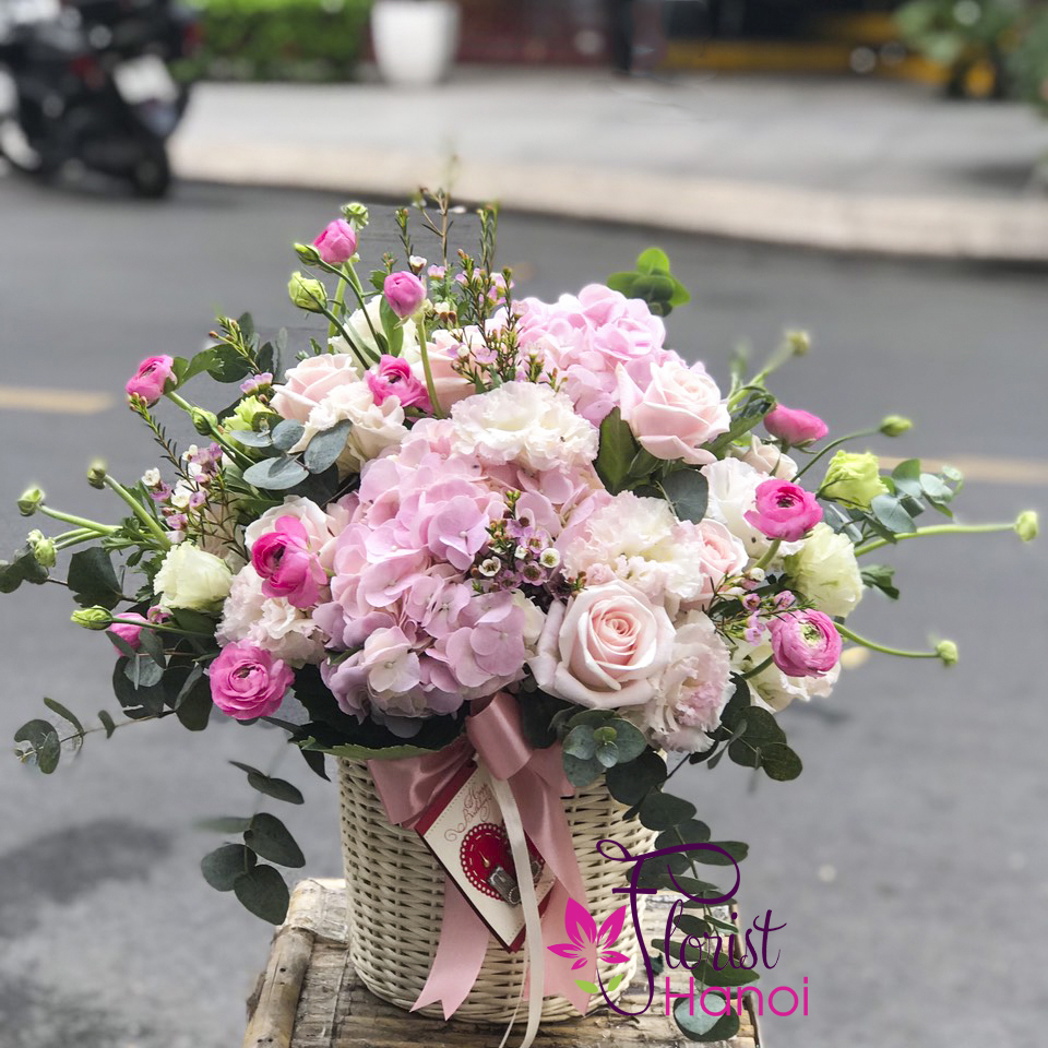 Send this radiant mix pink hydrangeas, pink lisianthus and pink roses…in a basket. it’s the perfect choice for birthdays, or any day of the year! This arrangement are the featured in this pretty and bright basket of dlowers for delivery in Hanoi.