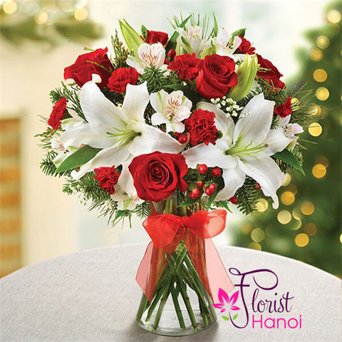 Fill your home with our Christmas flowers. The red and white bouquet is created by a florist with red roses, white lilies, red carnations and lush greens. These seansonal flowers are the perfect decoration for a holiday table or in the office around Christmas. All the flowers are delivered in a tall red vase, with a card message to send your Happy Holiday message.