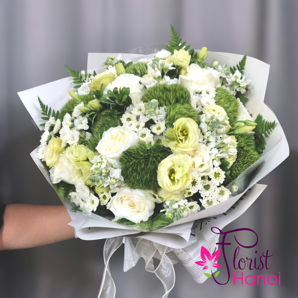 | Kind of flowers | White roses, Lisianthus, green wicky |