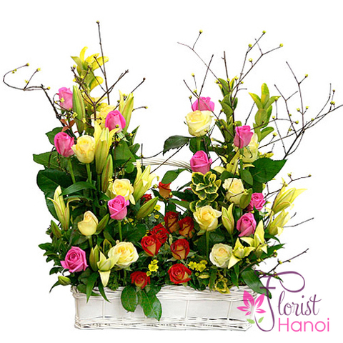 Yellow lilies are slowly spreading their petals, touching the smoothness of roses, and the frangrance of the two flowers overwhelms the senses. The birthday flowers bouquet can be offered as a sign of sincere friendship, to show you gratitude or admiration, or to wish someone dear a speedy recovery. No matter the occasion, with its charm of brightly colors, the bouquet will be received with smile and thanks.