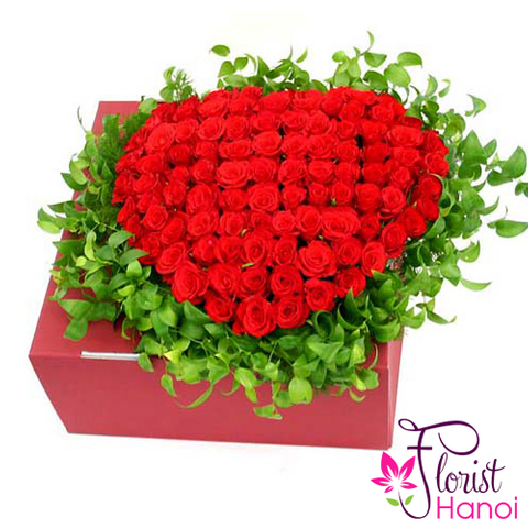 Scarlet roses fashioned into the shape of a heart, lined with a varity of green leaves, expresses ardour and utter devotion. Send this explicit expression of your feelings to the person of your dreams.
