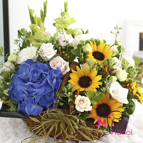 Celebrate the beauty of a floral arrangement that appears as if it was picked straight from fields. Florist arranged┬áwith Summer flowers including sunflowers, pink roses, Hydrangea and more. Delivered with the arrangement is a woven basket. Send flowers to celebrate today’s special occasion: new home, birthday…
