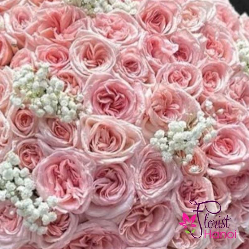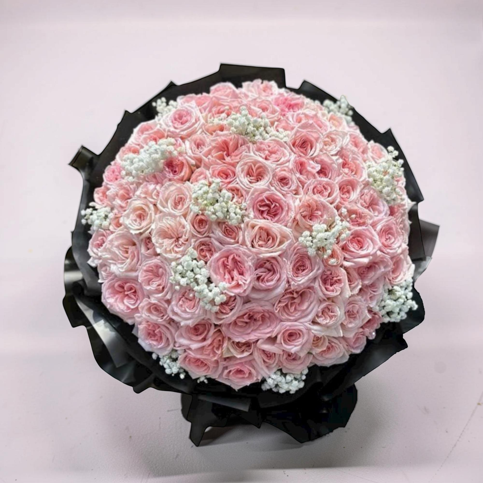 This stunning bouquet is sure to thrill anyone with its gorgeous. This bouquet consists of 99 stalks of pink roses, accompanied with baby breath. Every woman dreams of receiving a wonderful surprises from the man she loves. Make that fantasy come true with the ultimate collection of elegant pink roses.