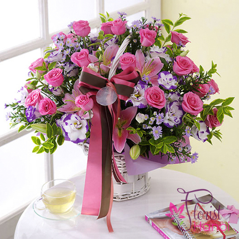 Kind of flowers Pink Roses, Lisianthus, Lily