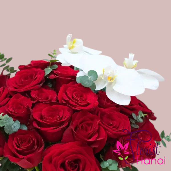 Nothing speaks of love so much as red roses and there’s no better way to express your feelings. This gorgeous roses decorated with white pahlaenopsis orchid in a box that will be a wonderful way to convey your heart’s every emotion. Long associated with beauty, red roses are a time-honored wway to say I love you.