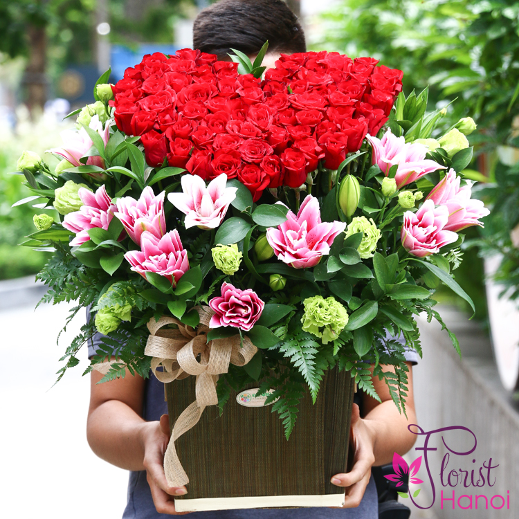 A bouquet of fresh roses ranging from soft pretty pink. The red rose speaks of love silently between two-person; in a language known only to the heart which usually shows deep feelings. This heart shaped arrangement of red roses and pink lily flowers ias a perfect gift for birthday, anniversary or wedding celebration for the person you love the most. It is the best way of expressing your love. This is a classically awesome way to say I LOVE YOU with this beautiful red roses which is nicely decorated.