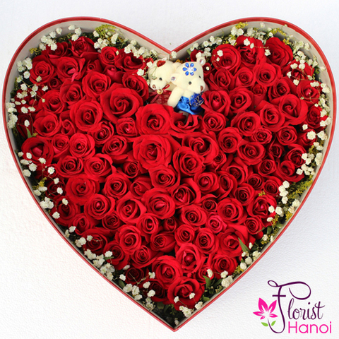 All the elements of love – romance, surprise, beauty – are gathered into a lovely box. What a delightful surprise it will be when your loved one lifts up the cover to reveal a heart-shaped arrangement of crimson roses, and a lovely couple of bear nuzzling against it.