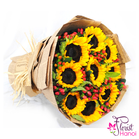 Sunflowers are made merrier with red Hypericum Berries and bright coloured wrappings. A winsome hand bouquet that will lift the spirits. It comes in 3 different sizes for you to choose from: