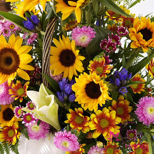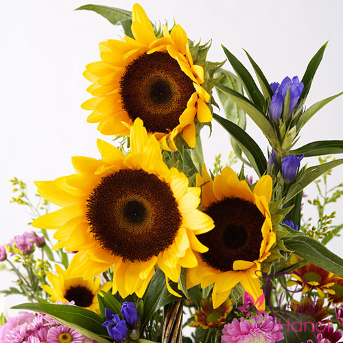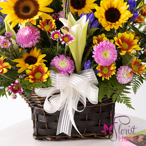 Garden fresh flower arrangement inspired by sunflower fields and daisy meadows. This summer flower mix features top-quality Sunflowers and daisies complimented with pretty parvi. Your beautiful blooms will be hand-wrapped by our florist team and delivered in our exclusively designed flower basket.
