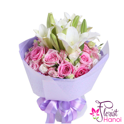 Convey your warmest wishes with this gorgeous, but super fun, white lily and pink roses bouquet. Lush long stem blooms are sure to delight your special recipient whether as flowers for mom, a girlfriend, or just for nayone close to you. The centerpiece is truly a beautiful rose and lily present that’s sure to leave a lasting impression.┬á